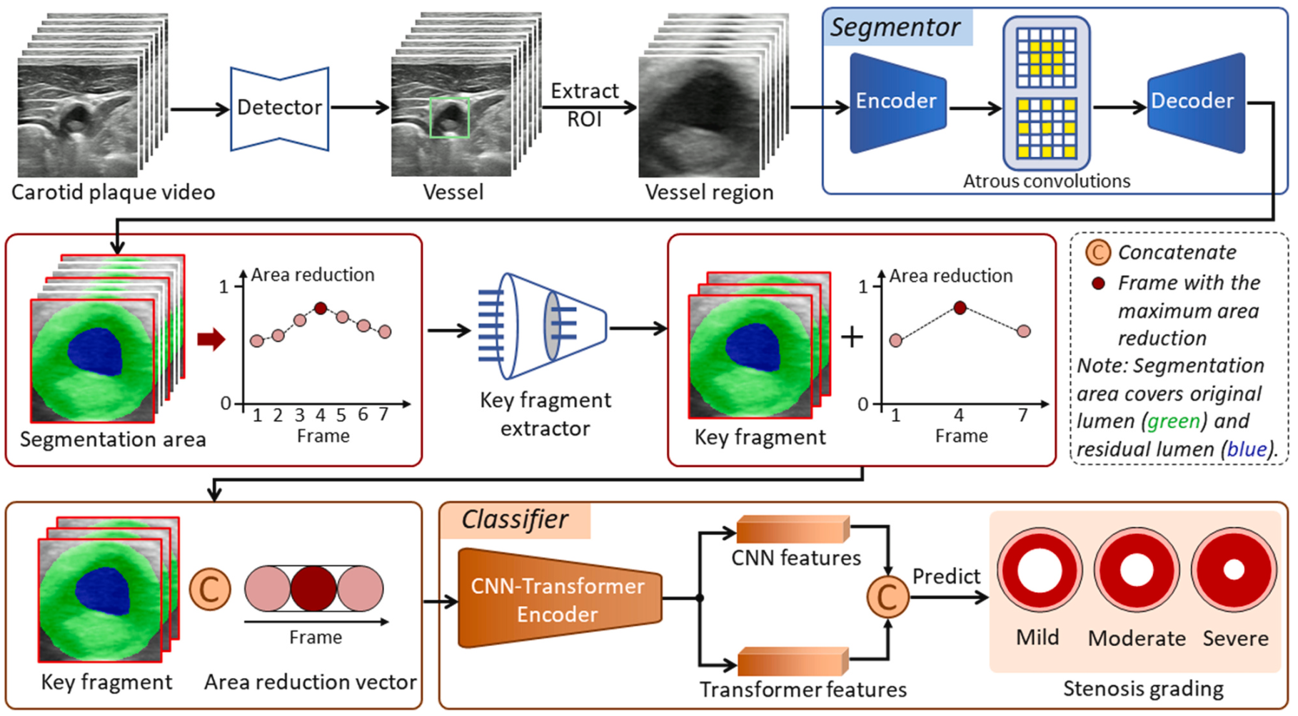 Human-machine interaction based on real-time explainable deep learning for higher accurate grading of carotid stenosis from transverse B-mode scan videos Jia Liu*, Xinrui Zhou*, Hui Lin, Yuhao Huang, Jian Zheng, Erjiao Xu, Hongye Li, Min Zhong, Xin Yang, Xindi Hu, Xue Lu, Dong Ni, and Jie Ren European Journal of Radiology, 2025. [paper] |